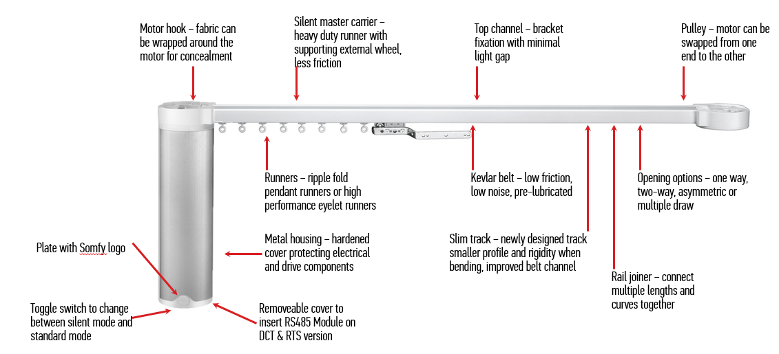 - Low noise level from its motorised track thanks to the motor design and the use of a timing belt
