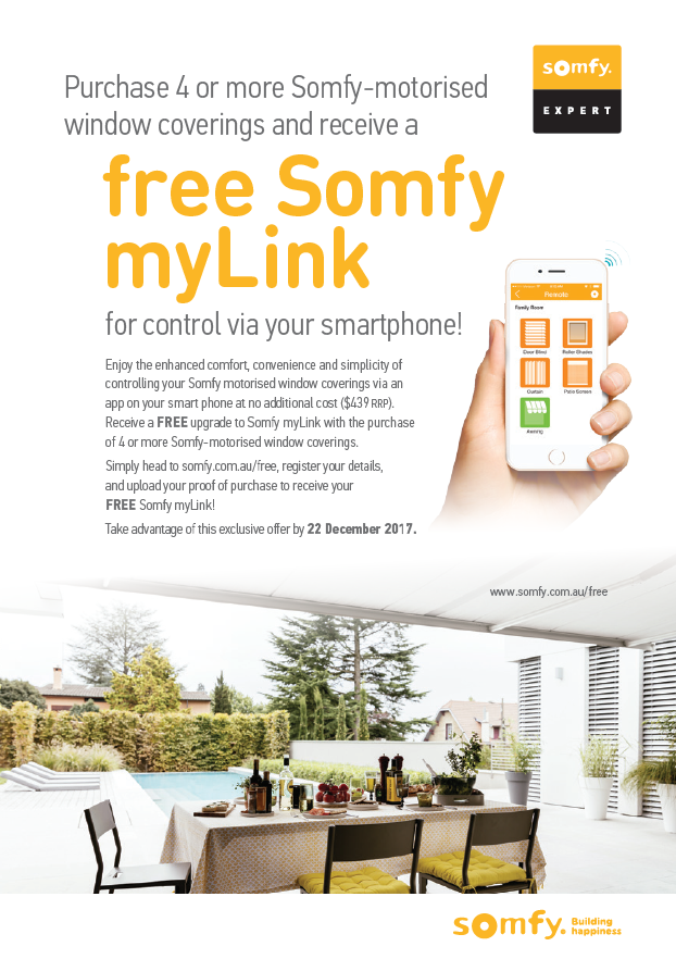 For every qualifying sale between 00:01 (AEST) on 1 October 2017 and 12:00 (AEST) on 22 December 2017, Somfy will provide your customer with a FREE Somfy myLink device (RRP $439).